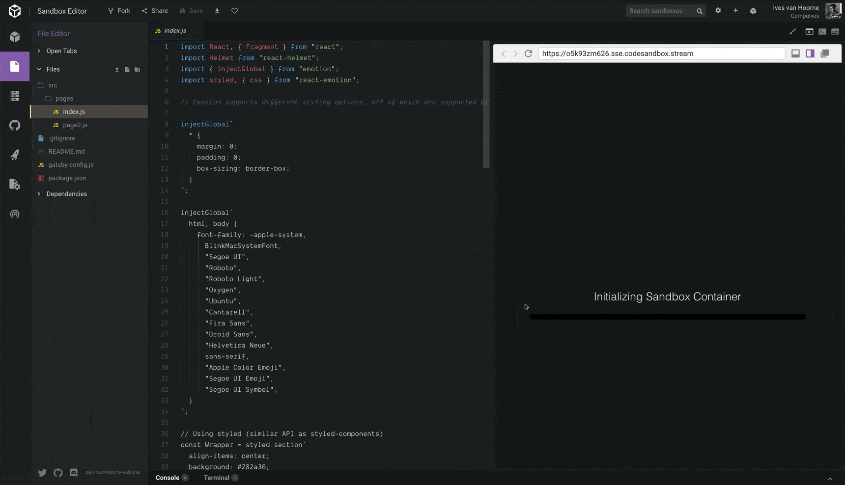 Today we're happy to announce CodeSandbox Containers. We execute your code on a server, which allows you to work on any JavaScript project that works locally.
