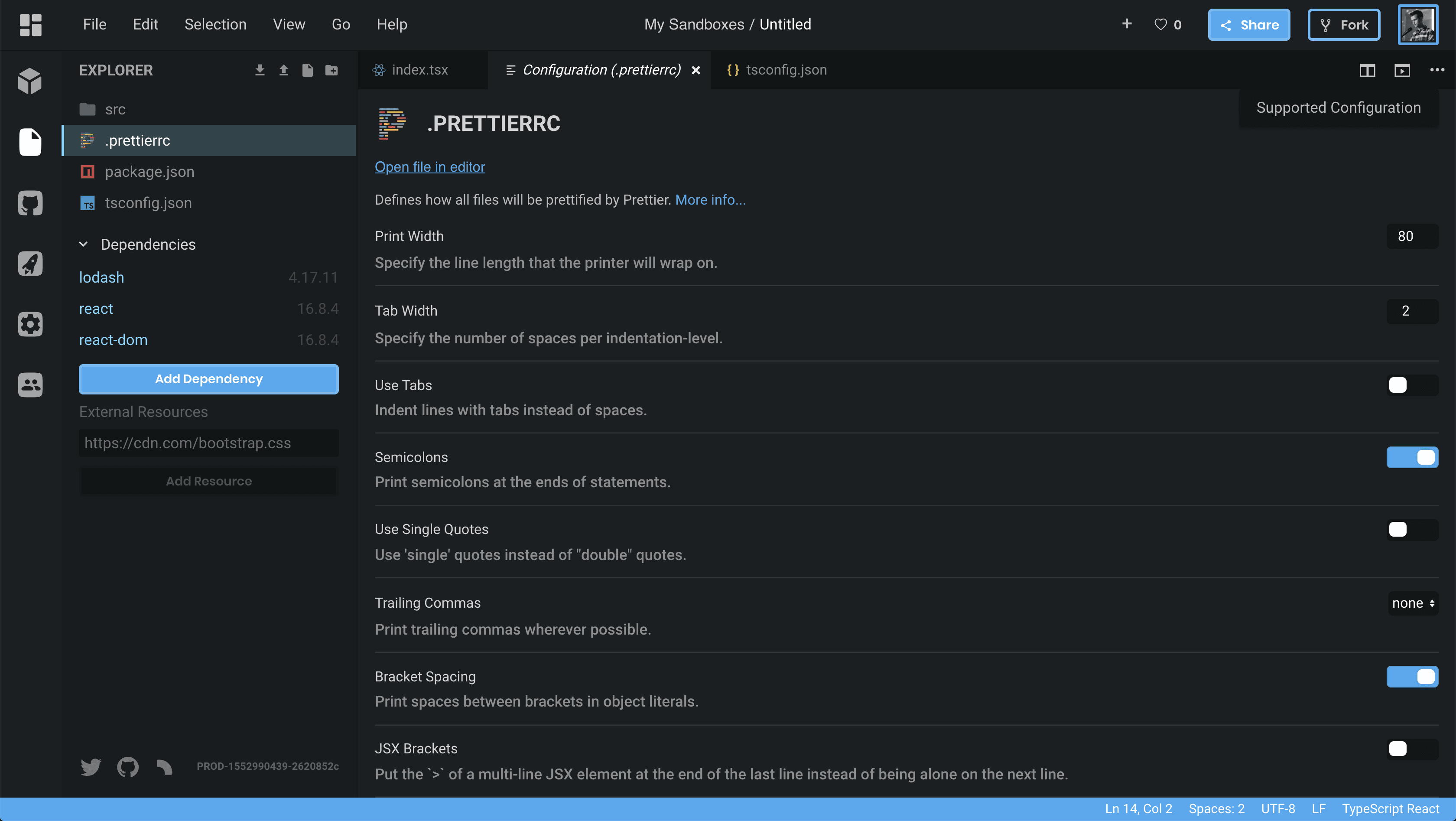 In October we released an experimental version of VS Code that you could turn on in your preferences. This replaced the core editor in CodeSandbox with VS Code, which gave us keybindings, user snippets, commands, editor grid view and much more from VS Code.