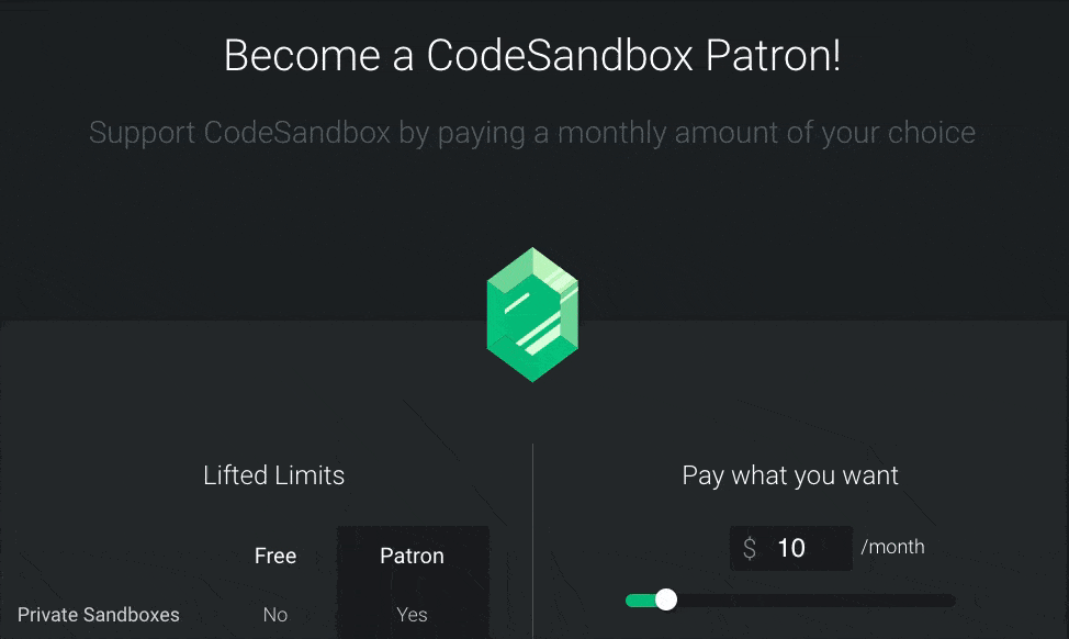 You can now support CodeSandbox by becoming a Patron! You get a badge based on the amount you donate per month, which will be shown on your profile page. You can hide the badge in your preferences. The income will go to server costs and further expenses of CodeSandbox.