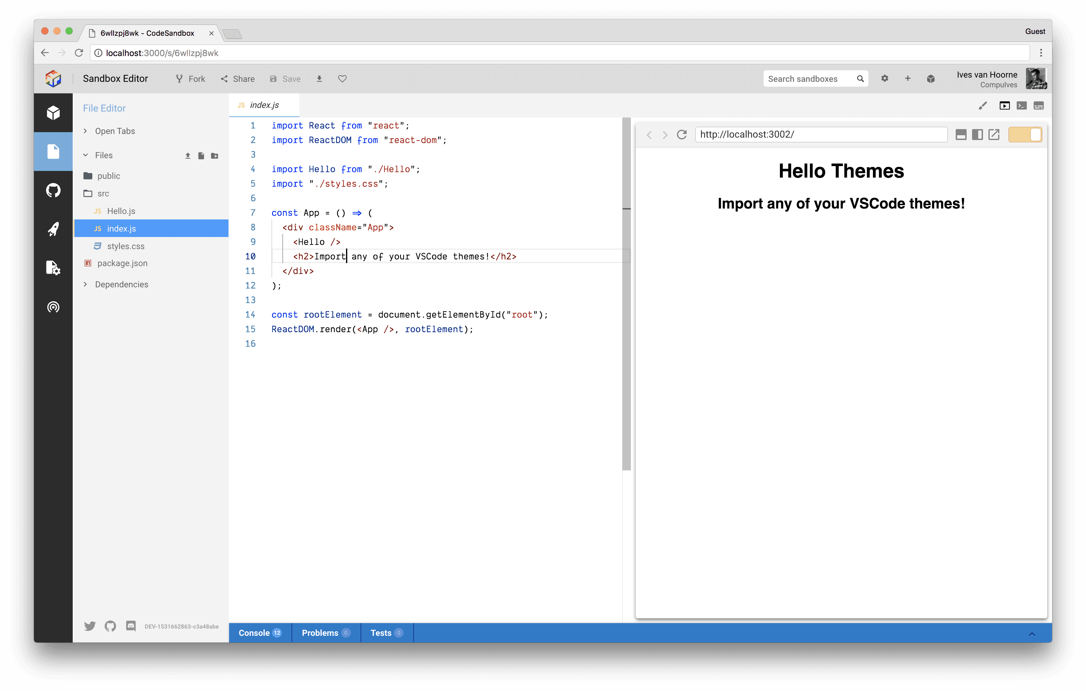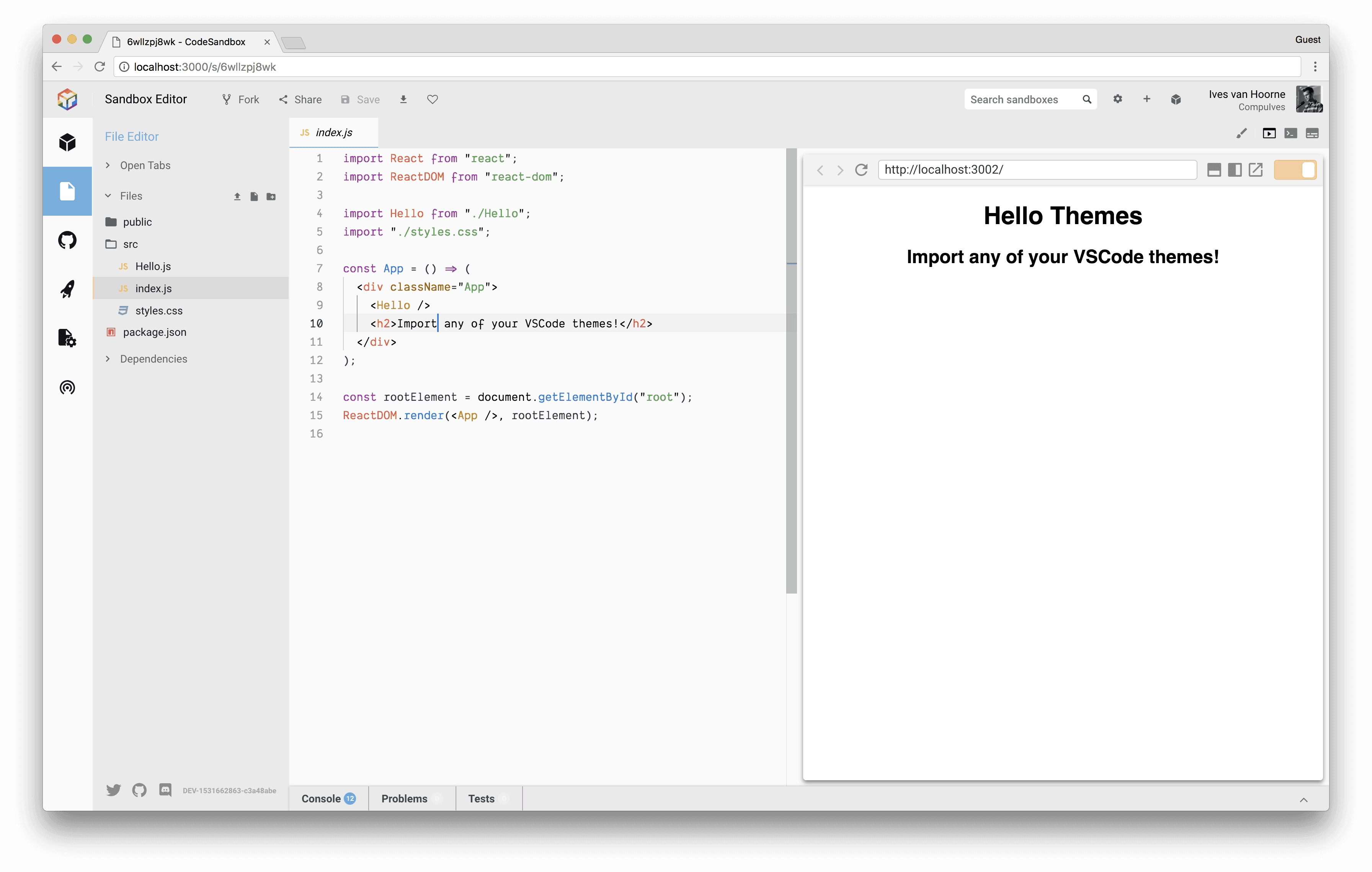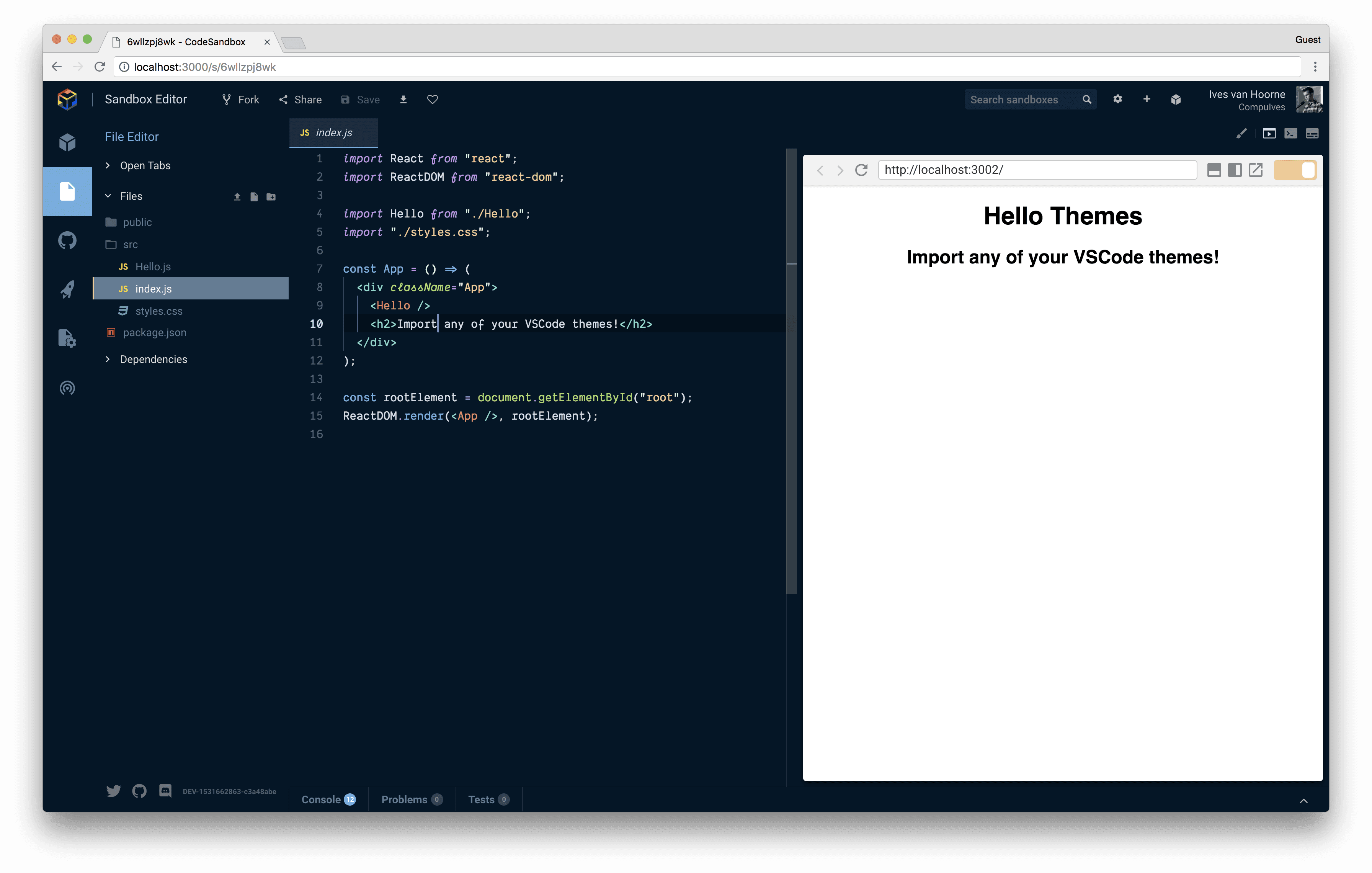 CodeSandbox didn't have any way to personalize colors in the editor since release, but I'm happy to announce that we do now. The best part is that we were able to reuse a big chunk of logic from VS Code directly and thus we support any VS Code theme natively in CodeSandbox!